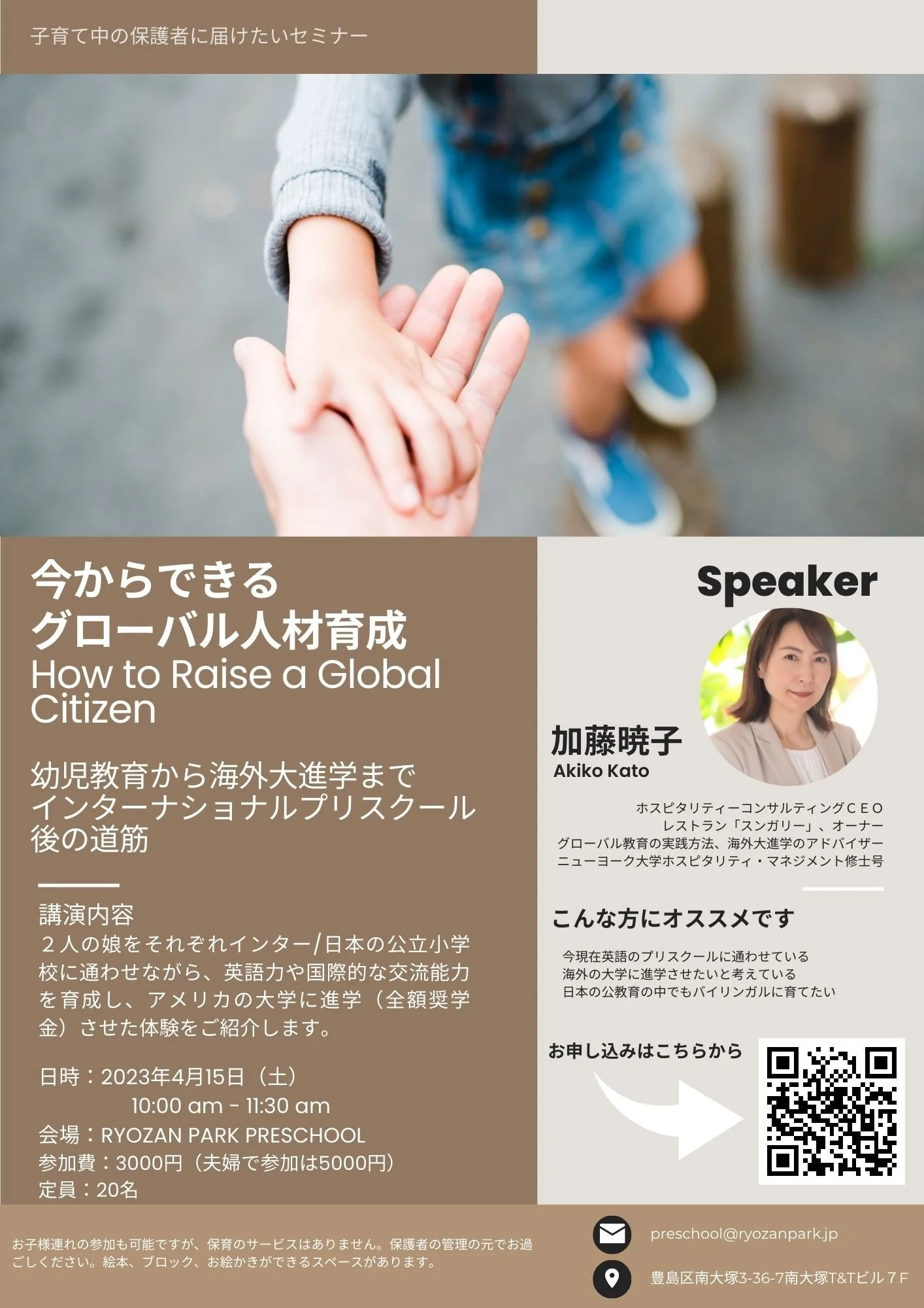 今回は未就学児のお子様のご両親に、娘二人を日本でバイリンガルに育てた子育て中のエピソードを中心に、目指すべき人材像、教育の選択肢についてお話しさせていただきます。