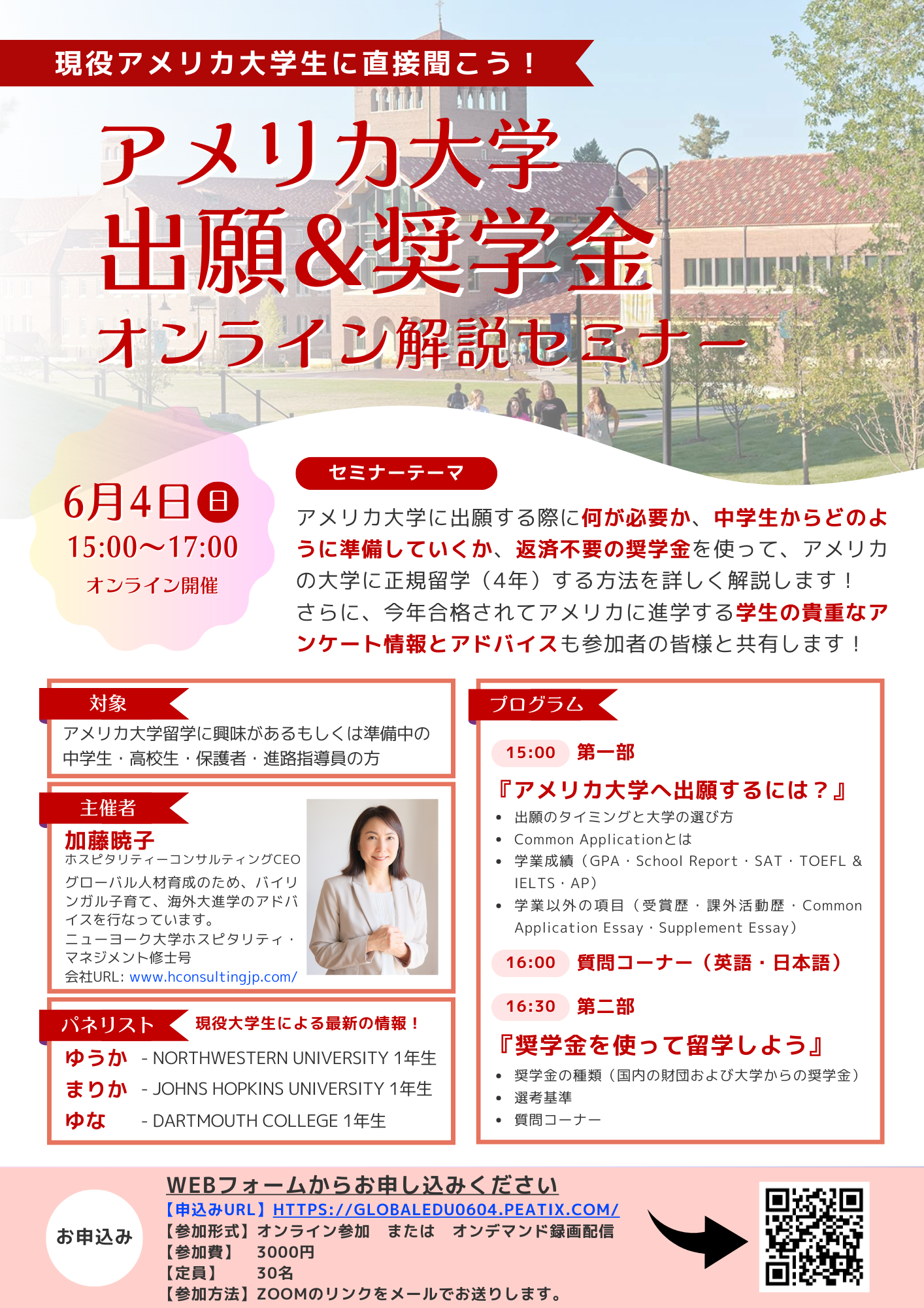 アメリカ大学受験の情報が意外と正しく伝わっていないと感じたことから、他の方には早くから正しい準備をしていただきたいと思い、セミナーを始めました。アメリカ大学に進学する場合、何をいつから準備したらいいか、どんな奨学金があるのか、アメリカ大学出願システムと奨学金について、今年日本の高校から入学した学生と母親の立場で詳細に解説します!